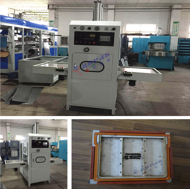 通過人工放料,高周波自動(dòng)熱合壓邊切熔,定型,工作時(shí)通過人工放料,放入模具位置上,按起動(dòng)開關(guān),底部模具滑板自動(dòng)滑動(dòng)到固定工作位置,機(jī)頭氣缸驅(qū)動(dòng)工模下降,通過預(yù)熱、高周熔接、切斷、定型,定型完畢機(jī)頭上升,底部工模滑板自動(dòng)滑出,人工取出成品。在生產(chǎn)中可自由設(shè)置各部時(shí)間,一般為3--6秒一個(gè)作業(yè)過程。