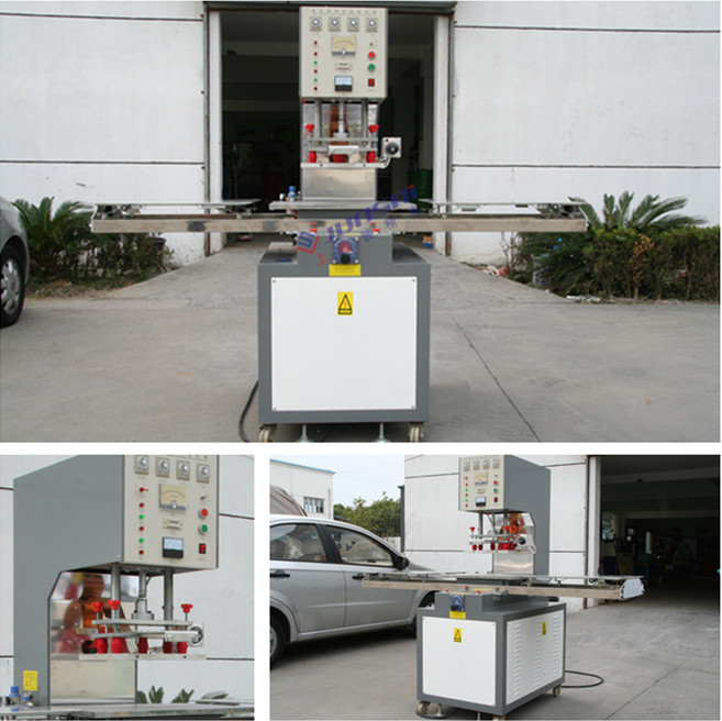 通過(guò)人工放料,高周波自動(dòng)熱合壓邊切熔,定型,工作時(shí)通過(guò)人工放料,放入模具位置上,按起動(dòng)開(kāi)關(guān),底部模具滑板自動(dòng)滑動(dòng)到固定工作位置,機(jī)頭氣缸驅(qū)動(dòng)工模下降,通過(guò)延時(shí)預(yù)熱、高周熔接、切斷、定型,定型完畢機(jī)頭上升,底部工?;遄詣?dòng)滑出,人工取出成品。在生產(chǎn)中可自由設(shè)置各部時(shí)間,一般為3--6秒一個(gè)作業(yè)過(guò)程。
