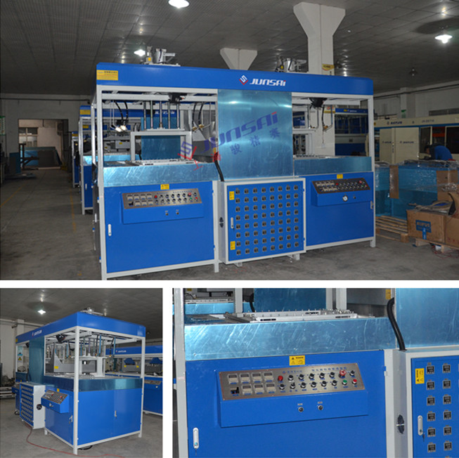 4. 把整板模具排放在下模腔內,四周密封,四周密封,再把“壓片”手動閥至升起位置,準備上料,把膠片拉過壓片位開關閉“壓片”手動閥,使壓片框壓住膠片,調好加熱時間,后用手拉動電爐至工作位置,進行加熱,觀察加熱狀態(tài)下的膠片,調整加熱時間,使之在佳狀態(tài)下做出好產品,加熱完后,即開始報警,(如加熱不夠可進行二次加熱),把電爐推向空位或二模框,一模下模上升到位,馬上扭去吧真空扭制,噴水開關。成型后下模下降壓框升起,把產品拉出,壓框下壓。整個過程完成后,二模馬上又可以操作,調整好時間制后,兩個模框即可來回半自動生產。