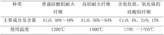 硅酸鋁耐火纖維又稱為陶瓷纖維,其主要組成是SiO2、Al2O3、Fe2O3、K2O、Na2O等,其中SiO2和Al2O3占95%以上,F(xiàn)e2O3約占0.98%,K2O和Na2O約占0.5%。硅酸鋁纖維的表面光滑,內(nèi)部固相物質(zhì)以連續(xù)骨架形式存在,配合間隙中的低熱導(dǎo)率空氣,起到了保溫效果。生產(chǎn)硅酸鋁耐火纖維的方法是將精選的焦寶石原料在2000℃以上的電爐里融化,再采用噴吹或離心等方法使之纖維化。硅酸鋁耐火纖維按照其成分和使用溫度可以分為3類,如表2所示: